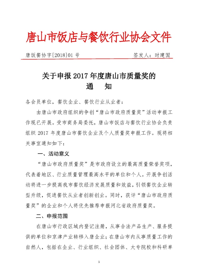 ★关于申报2017年度唐山市质量奖的通知