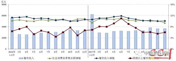 统计数据显示,2017年1-12月份,全国餐饮收入增速与上年同期略低0.1个百分点;限额以上单位餐饮收入9751亿元,同比增长7.4%,限上餐饮收入增速相比上年同期提升幅度持续收窄至1.4个百分点,限额以上餐饮增长略显乏力。