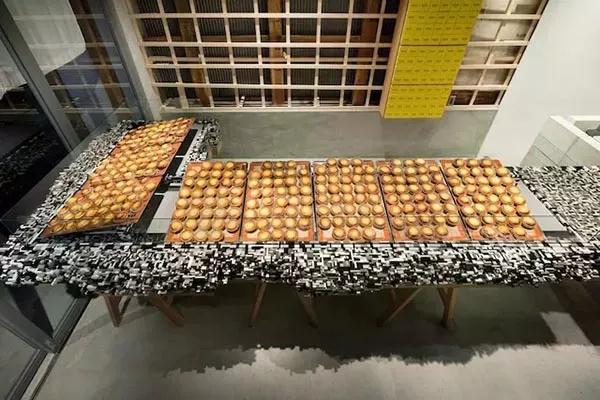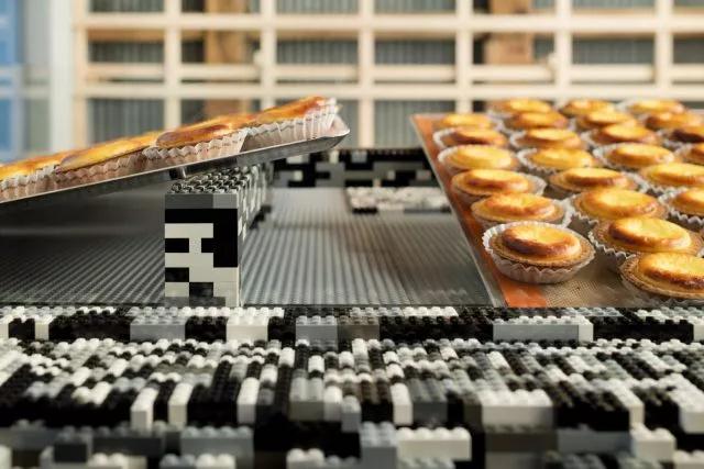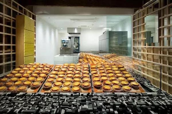 把乐高玩具积木堆砌成蛋挞的陈列台,密密麻麻的黑白灰色色块拼接在一起,置身于整个店铺的正中央,让人想不注意都难。