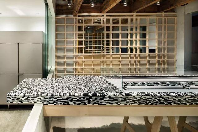 在这家店里,陈列台并没有延续传统建筑特有的历史气息选择木材+布艺装饰;而是反其道而行之,选择了一个新奇的材料——乐高玩具。