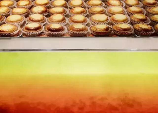 延续了Bake Cheese Tart一贯的陈列风格,这家店的蛋挞也是大面积平铺。彩虹色舞台的衬托下,它们好像也发出光来。