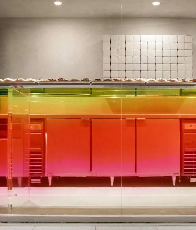 绚丽的灯光会丰富整个舞台的色彩,在 Bake Cheese Tart 北千住门店里,陈列台呈现半透明状,由黄绿到橙红色渐变,看着颇有舞台灯光的效果。