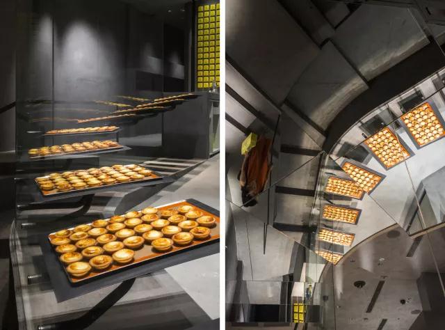 和大部分的场馆演出一样,这家店的购买区设置成了阶梯式。“舞台”也沿着阶梯式的“观众席”阶梯排列,在这家店里,一半交给蛋挞“表演”,一半留给“观众”欣赏。