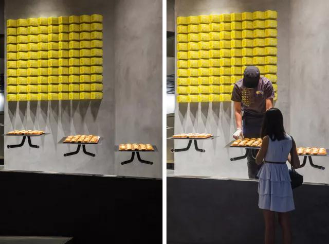不止是搭建了一块平面的桌子,为了便于顾客看到蛋挞,设计者还为每一块托盘设置了支架。托盘微微倾斜,顾客可以更完全地看见整齐排列的蛋挞。