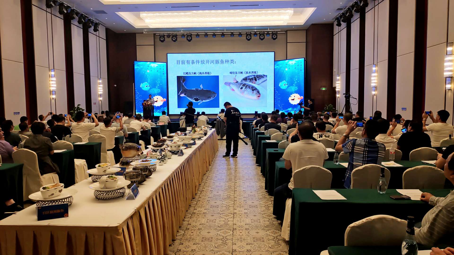 仪式上,为南湖会展酒店等四家唐山河豚鱼安全食用示范店进行了授牌。中国渔业协会河豚鱼分会负责同志对河豚鱼产业现状和有关政策进行了解读,海都渔业集团负责同志就河豚鱼加工、利用规范和菜肴烹饪进行了培训。