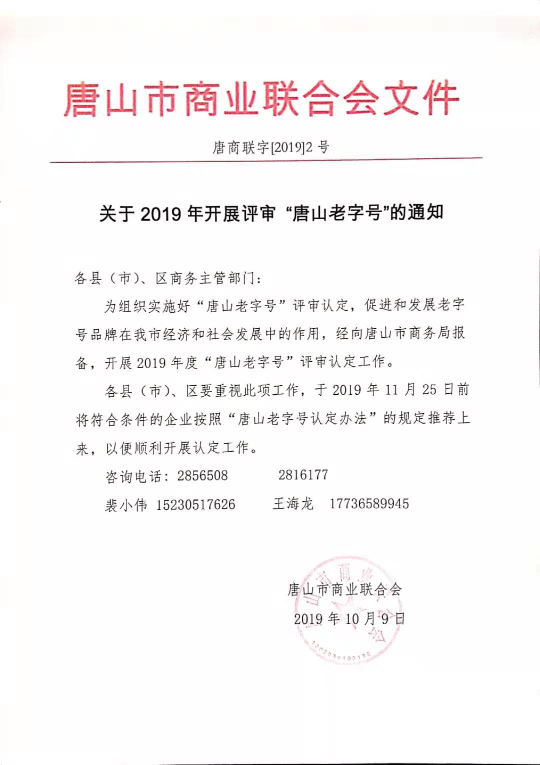 关于2019年开展评审《唐山老字号》的通知