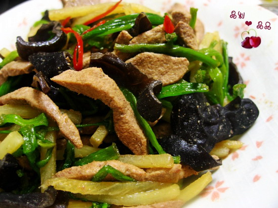 菜品口味:咸鲜 主要工艺:炒 所需时间:半小时 所用厨具:平底锅 材料:猪肝,鸭儿芹,春笋,泡发黑木耳,干辣椒,淀粉,酱油,绍兴酒,盐 ,麻油(普通)