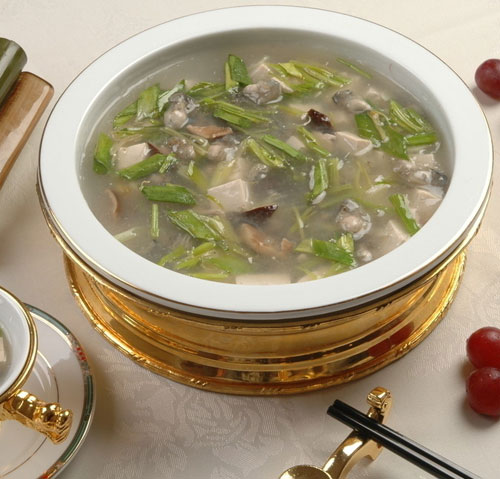 海蛎豆腐汤   原料:   海蛎、豆腐、葱花、香菜、辣椒。也可以加入鲜蘑菇。淀粉。   做法:   1.豆腐切成两厘米的小方块。海蛎肉在水中捞一下,主要是洗去皮渣,在水中捞一下即可 ,以免鲜味流失。   2.热油锅,加入葱花爆香,加入豆腐让油煎一下。后加入水烧开。后加入海蛎烧开,淀粉 勾芡。   3.烧开后加入香菜,葱段。胡椒粉或是辣椒粉。滴入几滴香油就可以喝了。(图文)