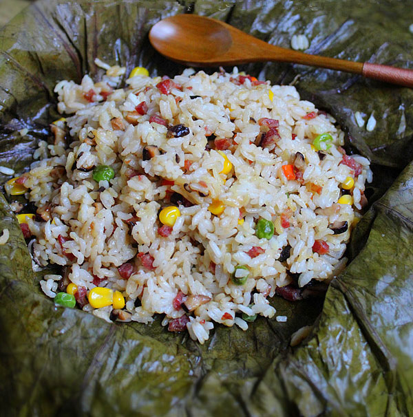 荷叶蒸饭是一道营养丰富,鲜香味美的家常蒸饭。用做荷叶蒸饭的米饭可以用糯米饭,也可以用糯米和普通米各半,还可以只是普通米饭都可以。米饭里的配料也可以自行选择,如青豆、玉米、干贝、火腿肠等都可以,当米饭吸收了佐料的精华,再加上荷叶的清香,简直美味不可挡。(图文)