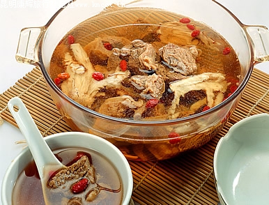汤料:羊肉200g,中药材肉苁蓉、续断各12g,料包、生姜和食盐适量。 制法:羊肉洗净、切块,入锅内与绿豆十数粒(约5g)或者几片萝卜加水煮,暂不放调料,煮沸15分钟,将绿豆或萝卜和水一起倒掉,膻味即除;锅内再加清水、肉苁蓉、续断和调料;小火煨至羊肉烂熟即可,喝汤吃肉。 功效:滋肾助阳,祛寒壮腰,补益精血,健脾益肺。(普通)