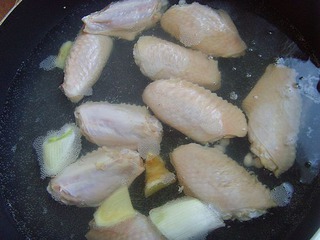 鸡翅洗净,入葱姜水中煮沸捞出,沥干水份。