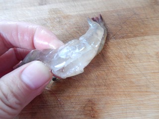 把对虾平放在菜板上,用刀平切入,取出黑线。