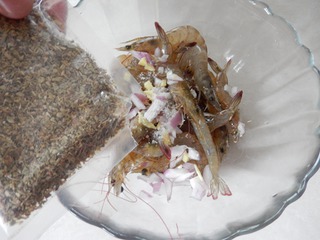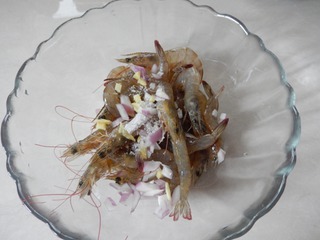把处理过的虾子放碗里,加入洋葱末、姜末和蒜末。
