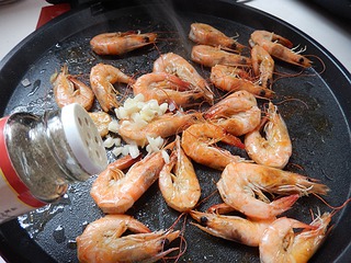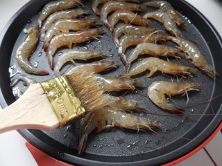 在对虾上涮上油。盖上盖子。