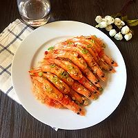 6.将搅拌好的蒜末填进虾背处,粉丝垫于盘底,将虾放入,造型自己发挥吧!热水上锅蒸七分钟,焖两分钟