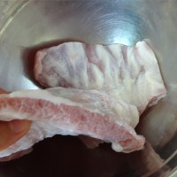 2猪肉切成约4指宽的长条,先加入白糖抓匀腌制至糖全部溶化,中途要翻动几回。