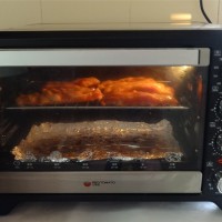 9烤箱预热两分钟,烤盘上铺上锡纸接油,把烤网置上数第二层,上下火加热风,220度烤30分钟左右。
