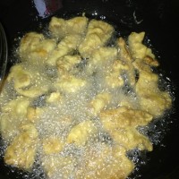 2鸡蛋生粉拌匀(不要加水),包裹肉片入油锅炸(中火)至肉片浮起来,变色翻面,捞出淋油,再复炸半分钟。