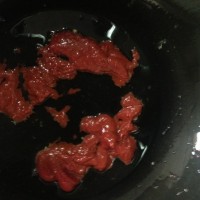 3空锅放入熟油、番茄酱、糖、白醋、姜丝、葱丝、盐,开中火,用勺子搅匀