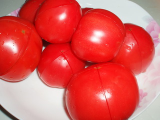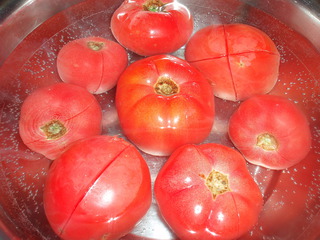 5.锅中水烧开,把西红柿倒入锅中,打个滚捞出,去掉皮