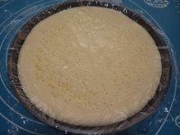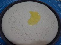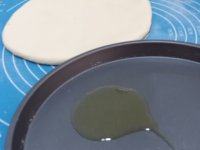 3.用手揉压出面团内部的气体,面团重新变小,将面团再发酵15分钟后,擀开成圆形的面片。比萨盘加适量橄榄油,并涂均匀。