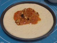 4.将面片铺在涂了油的比萨盘里,用手掌压平,要中间薄,周围厚些,并在表面扎些小孔,再加些橄榄油。