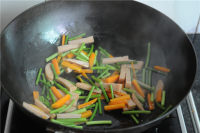 2.烧开一锅水,将蒜薹和胡萝卜到进去烫熟,捞出沥干水
