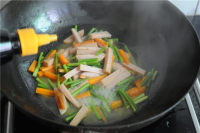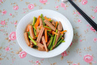 1.午餐肉切丝,胡萝卜切粗丝,蒜薹切断备用