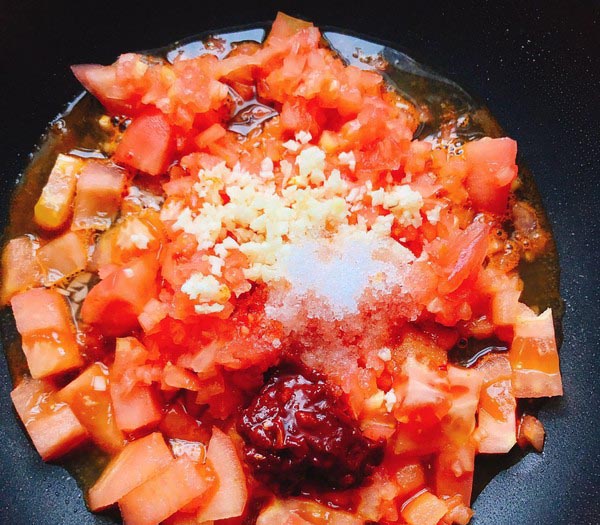 番茄洗净去皮,一半切小丁丁,一半切丁丁,加入大蒜,白糖,芝麻油,红油豆瓣酱,盐。一起放入平底锅。