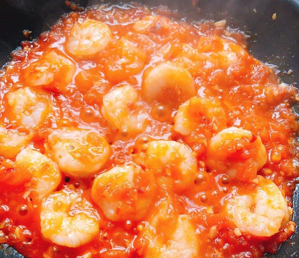 中高火煮开后,再加盖煮5分钟,再开盖煮到番茄变浓稠了,倒入煎过的虾仁翻炒均匀。
