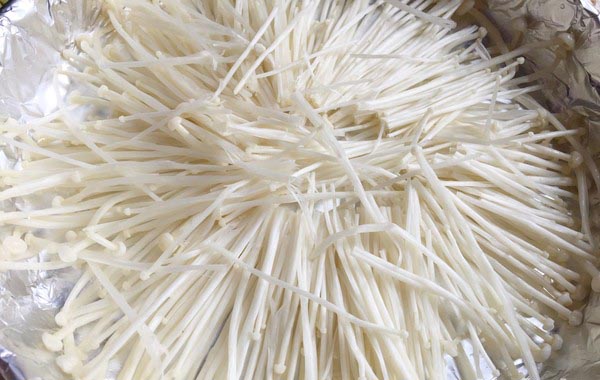 金针菇去头,洗净,控干水分,平铺在烤盘上