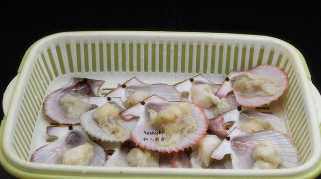 剥开扇贝,去内脏,洗净干净,把肉留在一半的贝壳上,另一半去掉;