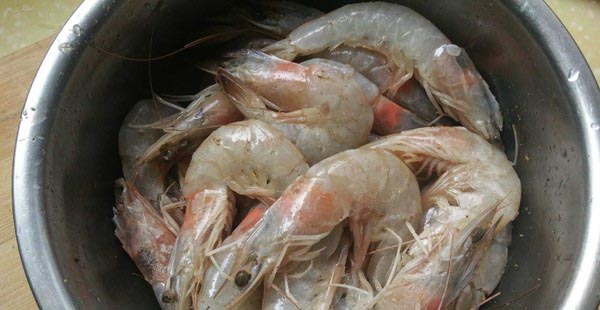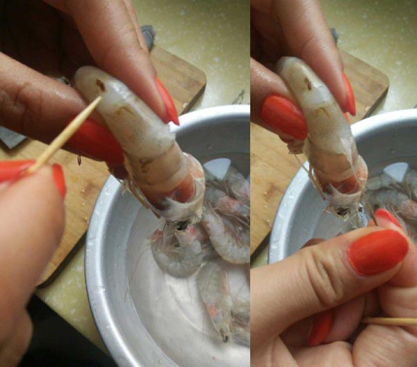虾挑去虾线(在尾部第二节处插入牙签后往上挑,轻轻一拉虾线就出来了