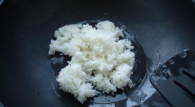下青豆、火腿、红萝卜、玉米与饭一起,小火炒2分钟