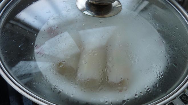 做鱿鱼或是墨鱼包饭了,只要除去内脏,清理好,晾去水份就可以用了,不用什么独门的手法或秘笈...在鲜鱿鱼里塞入米饭、蔬菜等材料,放在锅里一蒸,就是鱿鱼包饭了,米饭吸收了鱿鱼的鲜味,好吃又简单,你可以整只拿起来就往嘴里塞着吃,也可以切成小件,蘸点海鲜酱油,很淑女的吃,哈...给米饭穿了件鱿鱼白衬衣,好吃