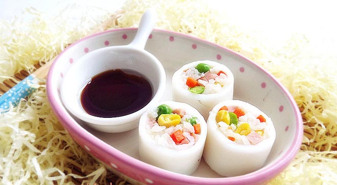 鱿鱼饭卷切件,取海鲜点蘸鲜露、山茶油放一小碟内,把鱿鱼饭卷蘸点食用