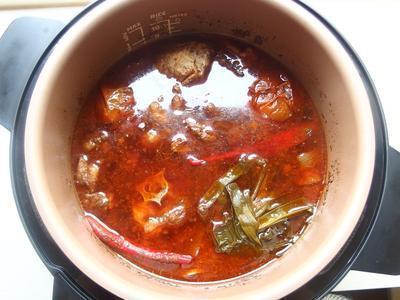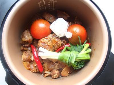 最后加入适量的高汤或水,水量超过食材高度即可。盖上锅盖,选择"牛肉"功能键做炖煮。(我是使用电子万用压力锅),如使用一般电锅或大同电锅,外锅放1.5杯的水,煮好跳起再焖10分钟即可。炖煮时间可依个人喜爱的熟度做调整。