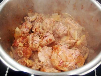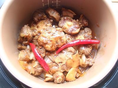 将炒好的牛肉块及酱汁都移至电锅的内锅裡。