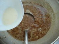 甜面酱炒出香味儿后加少许水,等汤汁煮沸后水淀粉勾芡。