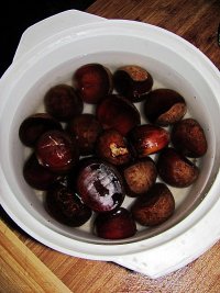 栗子洗净用刀在上面画出十字花痕,稍微深一点。