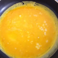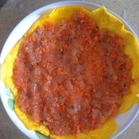 煎好的鸡蛋敷在盘子里,倒入切碎的虾泥敷均匀