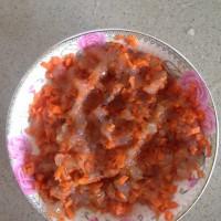 虾和胡萝卜切碎,今天有点急没有切太碎,切碎点好包一些,放一小勺盐,糖,酱油,淀粉,料酒拌均