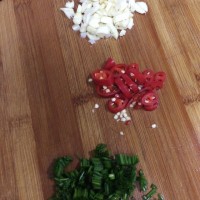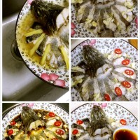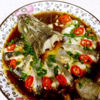 鱼出锅后,倒掉盘子中蒸出的水,摆上蒜末和红杭椒做装饰,倒上调制好的汤料(蒸鱼豉油、料酒、醋、白糖、香油),均匀地淋在鱼身上,然后再入锅蒸2分钟即可。