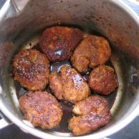 煎好的猪排放入酱汁中,使其两面均匀裹上酱汁