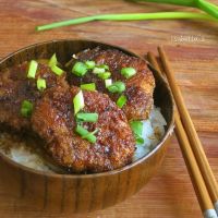 盛一碗热乎乎的白饭,放上适量的洋葱,最上面摆几块裹好酱汁的猪排就可以上桌了~