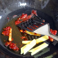 锅中倒入少许油,油热后放入一勺郫县豆瓣酱和姜片煸炒出红油(喜欢更辣一点口感的,可以往锅里再放一些干辣椒煸炒出香味)。