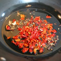 换一只干净的锅中,锅中倒入40毫升左右的食用油,然后将干辣椒和花椒放入锅中,小火煸炒至辣椒红亮,花椒出香味即可捞出放到鱼肉上。