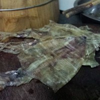 将鱿鱼干(为了迎合童鞋的认知,我姑且把乌贼干都叫做鱿鱼干吧)放在案板上,用刀背锤松(这么做绝对不是吃饱撑着的,一来鱿鱼干容易吃味进去,二来更容易手撕)