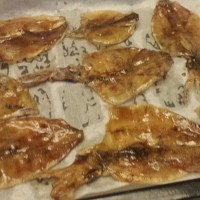 烤盘铺好油纸或者锡纸(哈哈,童鞋们看出来了不,这个油纸是俺烤曲奇留下的,不能浪费啊)。鱿鱼干两面刷上调料(别天真的烤一面翻身再刷一次了,乌贼干烤后会卷起来滴)。