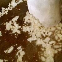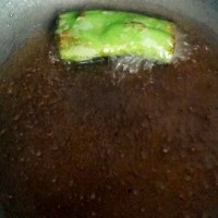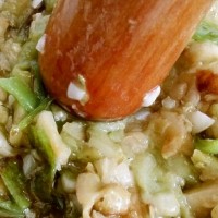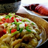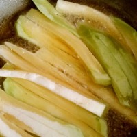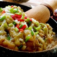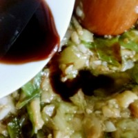把过好油的茄子和青椒放入钵中,炒香的蒜末带油一起倒进去,用捣锤捣烂,这个过程也就是擂。